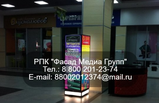 Реклама на пилларсе в торговых центрах пользуется популярностью среди рекламодателей. Стоимость размещения рекламы на данной конструкции невысока. Внутренняя подсветка пилларса позволяет сделать рекламный плакат хорошо заметным, рекламную кампанию успешной