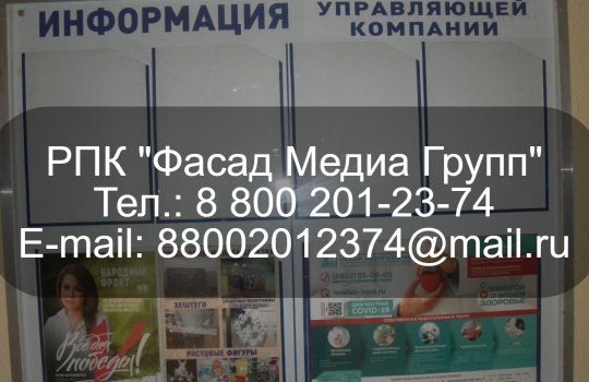 РПК «Фасад Медиа Групп» разместило рекламу в лифтовых кабинах. Рекламное объявление помещено на специальный антивандальный стенд. Период размещения – 15 дней